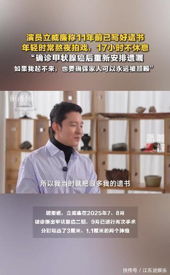 立威廉说11年前已写好遗书,年轻时常熬夜拍戏,17小时不休息,“确诊甲状腺癌后重新安排遗嘱,如果我起不来,也要确保家人可以永远被照顾” 。2025年12月8日,据媒体报道,演员立威廉在今年7、8月被诊断出甲状腺癌二期,9月已进行两次手术。立威廉称看到检查报告只觉得眼前一黑:“能不能看到我女儿长大?”他透露目前已99%切除肿瘤,但还是害怕扩散,目前在肺部有照出结节,之后需要持续治疗、吃药控制。但对于病情,立威廉的态度依旧乐观:“该接受治疗就治疗,平常该做什么就做什么,人生嘛不就是如此。”